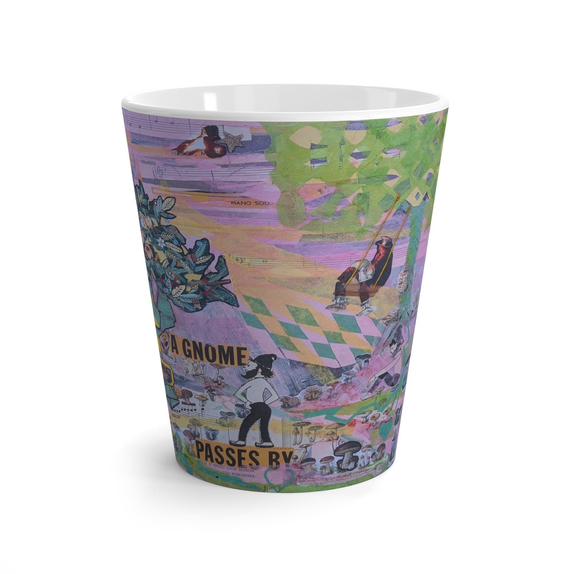 This latte mug features A Gnome Passes By, an original mixed-media collage built from painted layers, found imagery, sheet music, and whimsical cutouts. Mushrooms, trees, tiny figures, and hidden phrases unfold across a dreamlike landscape, inviting the eye to wander and discover something new with every glance.