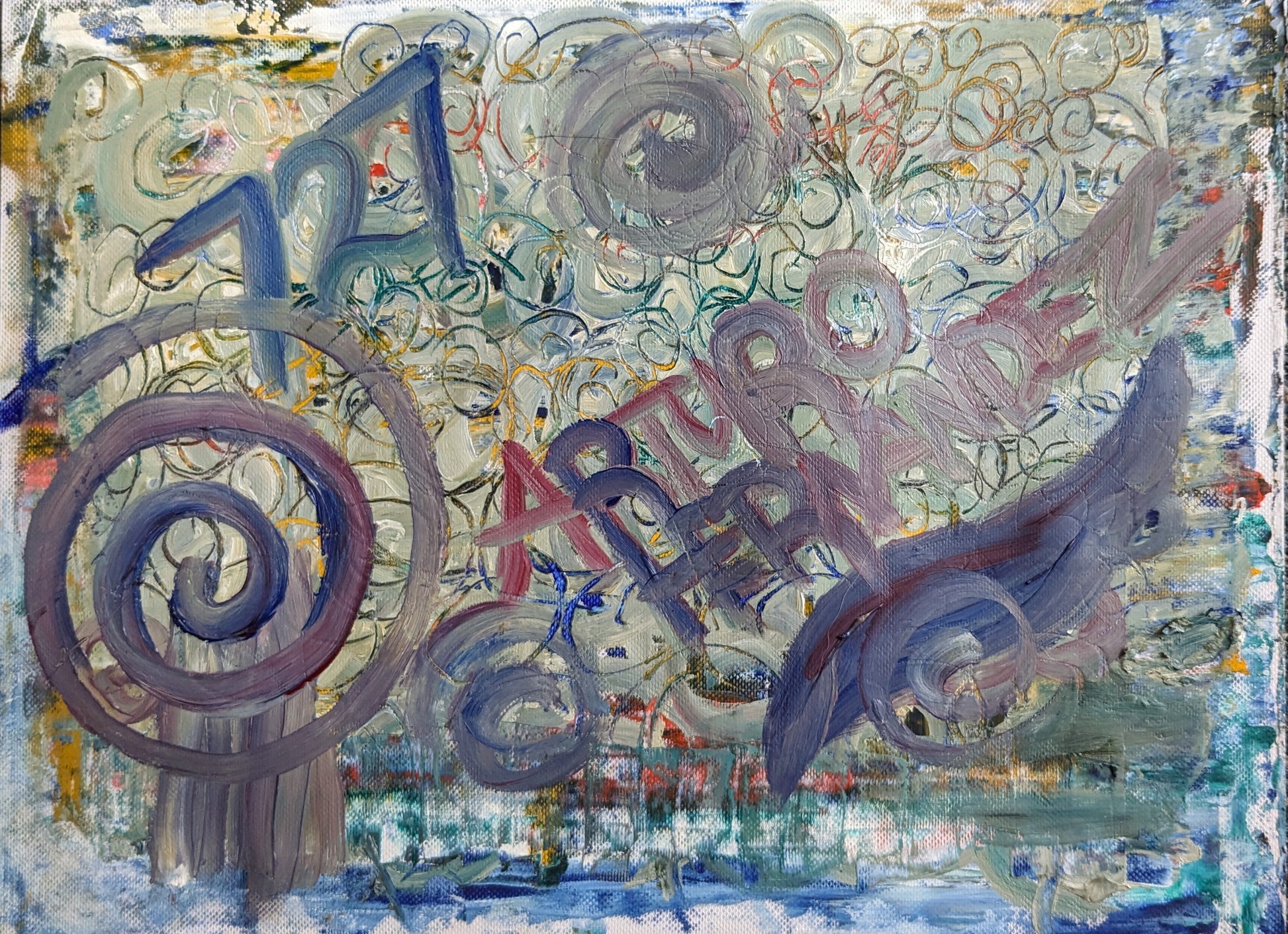 A lively composition of swirling purples, blues, and greens dances across the canvas, layered with abstract shapes and the artist’s own name emerging boldly from the paint. “Urban Crescendo” reflects Arturo’s spirited interpretation of city life—alive with energy, yet filled with hidden stories and symbols. Every brushstroke reflects the artist’s journey, and your purchase contributes to his progress toward a more secure future.